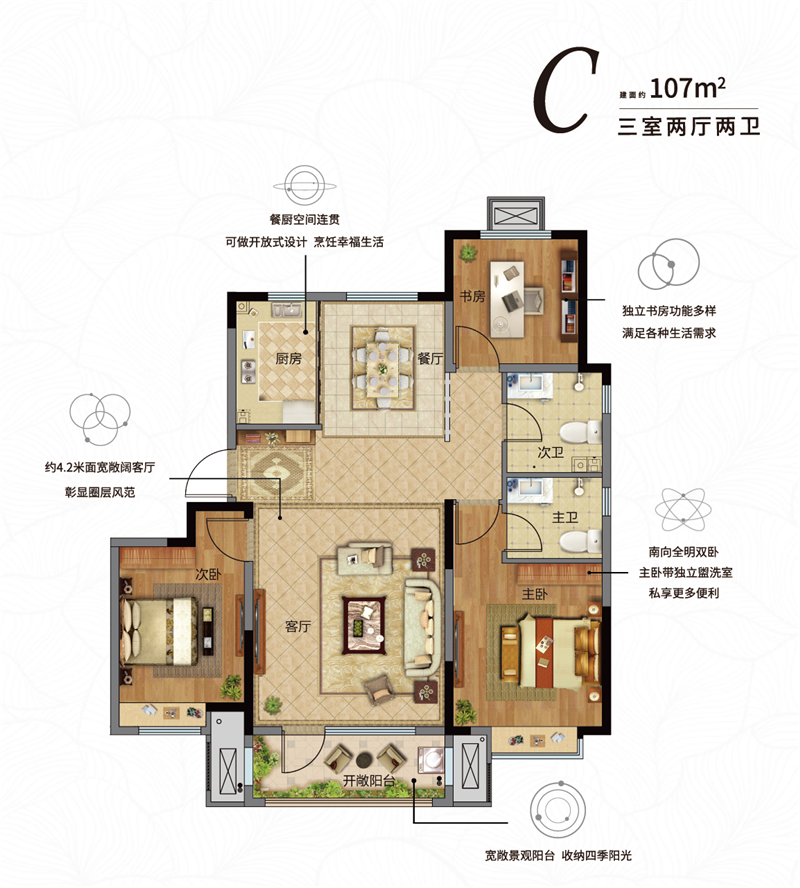 全明方正戶(hù)型,南北通透,瞰景寬綽陽(yáng)臺(tái),與家人一同共享四季景致的更替和全齡社區(qū)的活力。超尺度陽(yáng)臺(tái),除了晾曬、瞰景等常規(guī)功能外,多功能空間布局,匹配家庭每位成員的生活渴望。舒適主臥配備瞰景飄窗,締造生活儀式感;部分實(shí)景現(xiàn)房交付,即買(mǎi)即入住,幸福不必等待。